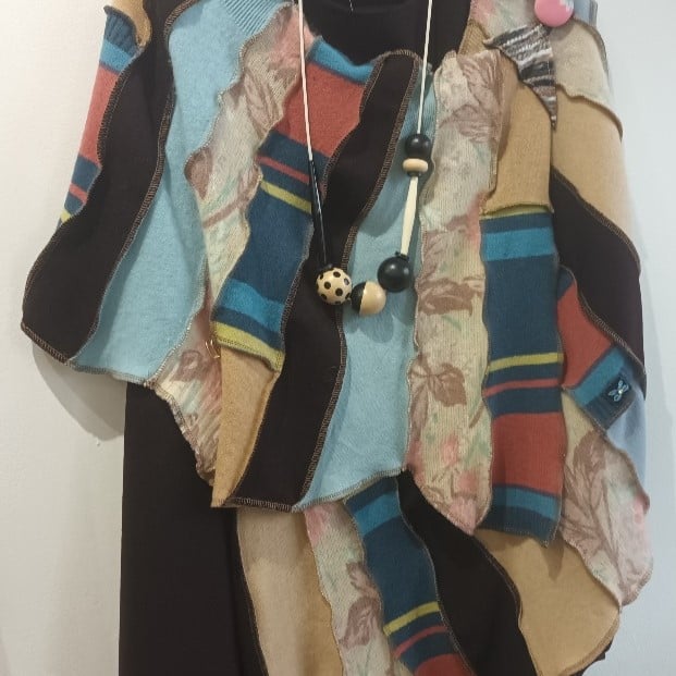 made from upcycled sweaters and fabric remnants, this shawl is one of a kind, mostly wool, mohair, cashmere, boiled wool...can be worn as a poncho, a scarf, a shawl or a bum cozy...aprox. 66" long